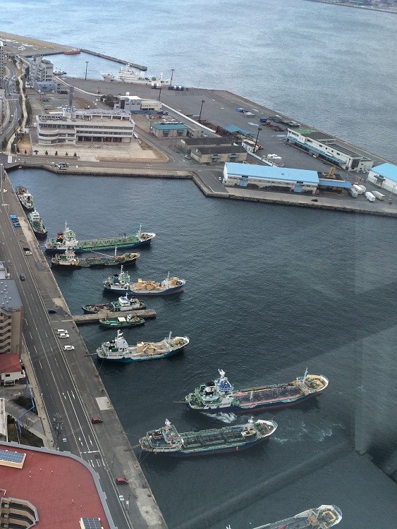 海峡ゆめタワーに上った時に展望室から下関港の様子がよく見えました。コンテナ船から釜山に行く旅客船など停泊していました。