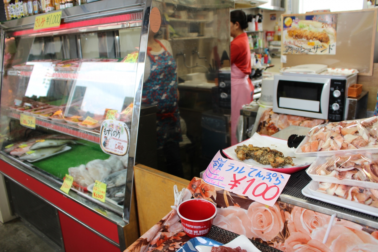 好みの刺身とご飯で@500円とリーズナブルでしたが、空腹でなかった為~もずく天ぷら(@100円)のみ購入・・中にイカ等が入っていて、食べ応えがありました。