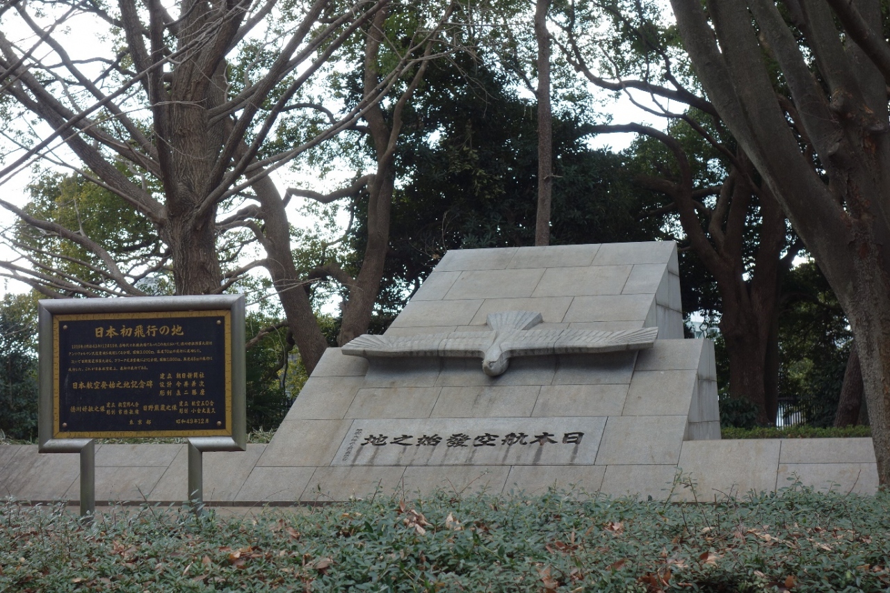 代々木公園へ入ってしばらく遊歩道を歩いていると、道の端に石柱に彫られたこちらの記念碑への案内が何カ所か目についたので、その矢印に沿って進むとこちらの石碑へたどり着きました。日本で初めて飛行機が飛んだ場所なのだそうです。