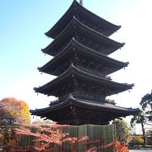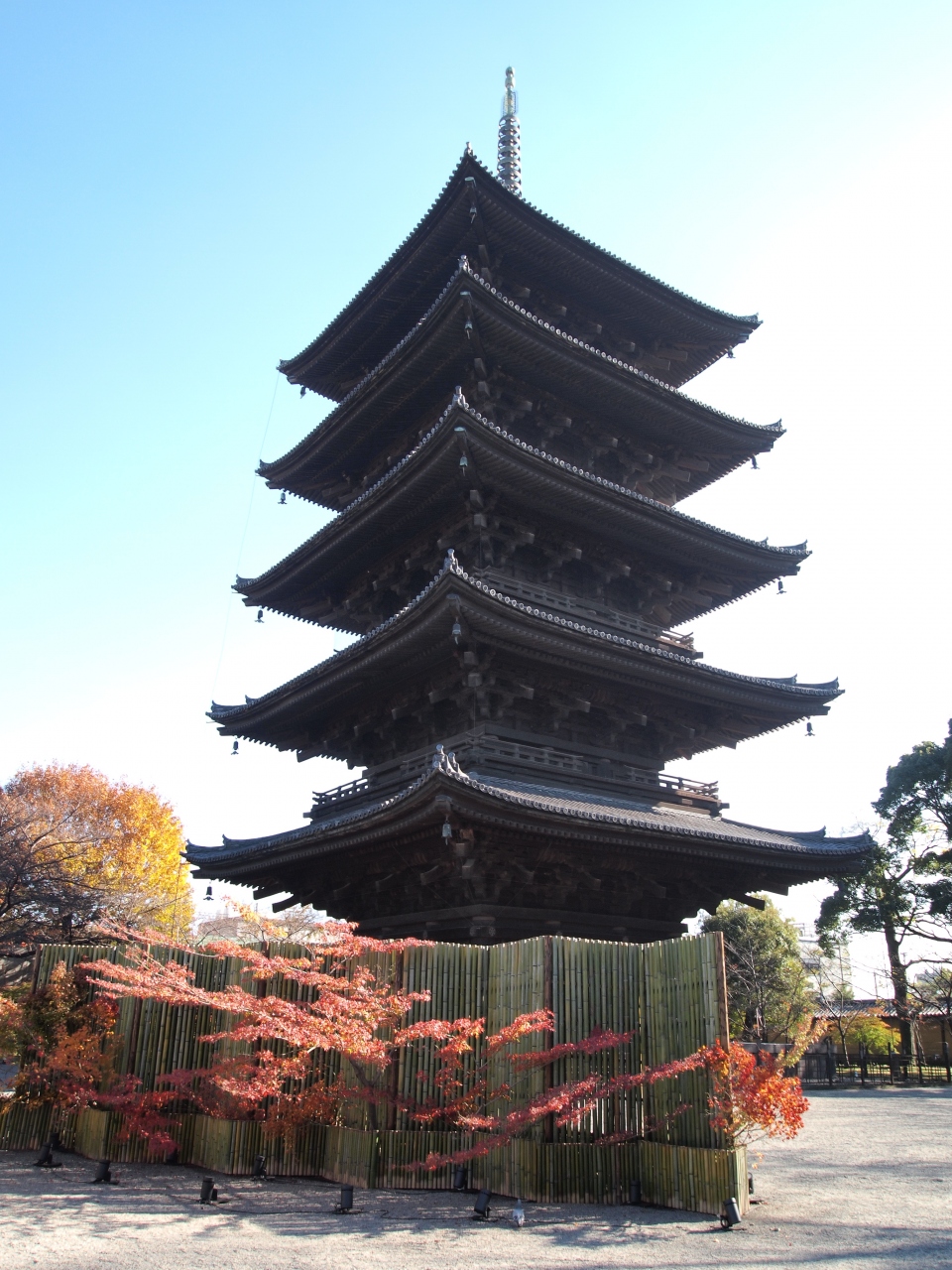 東寺の国宝、五重塔です。木造建築としては、日本一高いとの事で、確かに近づく全体像が判らなくなります。秋の紅葉の時期に行ったのですが、初層の特別拝観を行っていて、内部を見学する事ができました。内部の仏像を拝む事ができます。また、一番興味深かったのが、心柱の底の部分を見る事ができる様になっていて、五重塔中心を貫く柱が、どうやって立っているのかが判ります。