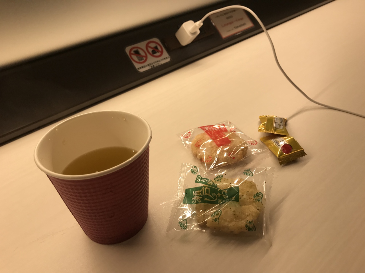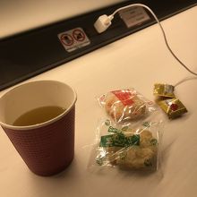 フライト前にあったかいお茶とおかきでホッと一息いれます。あと飴ちゃんがあるのも嬉しいですね。