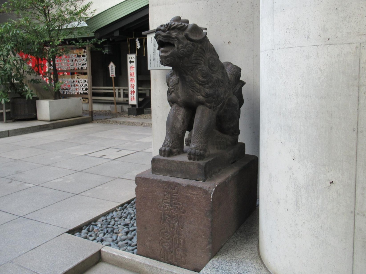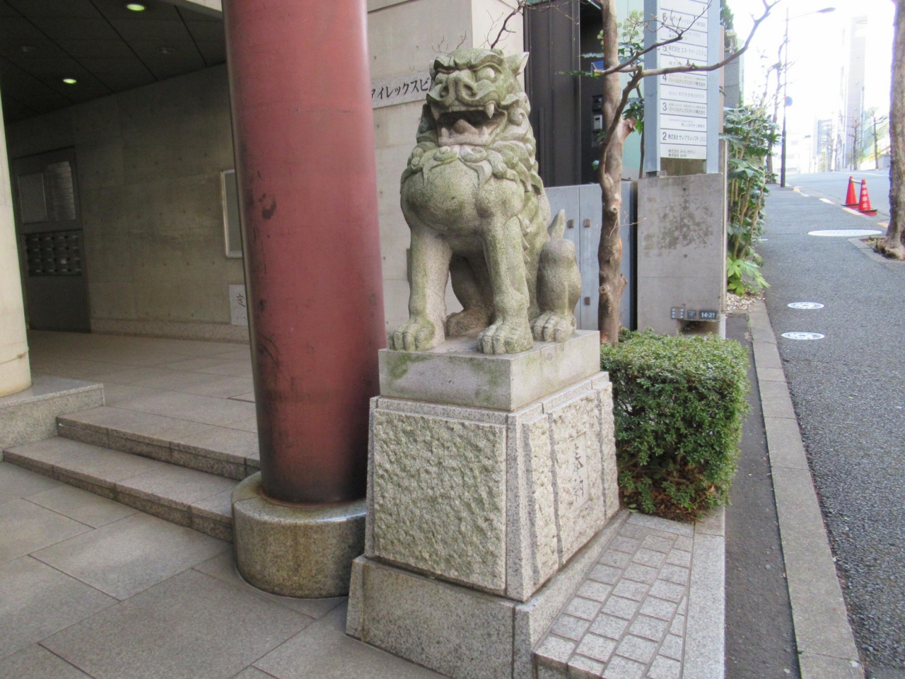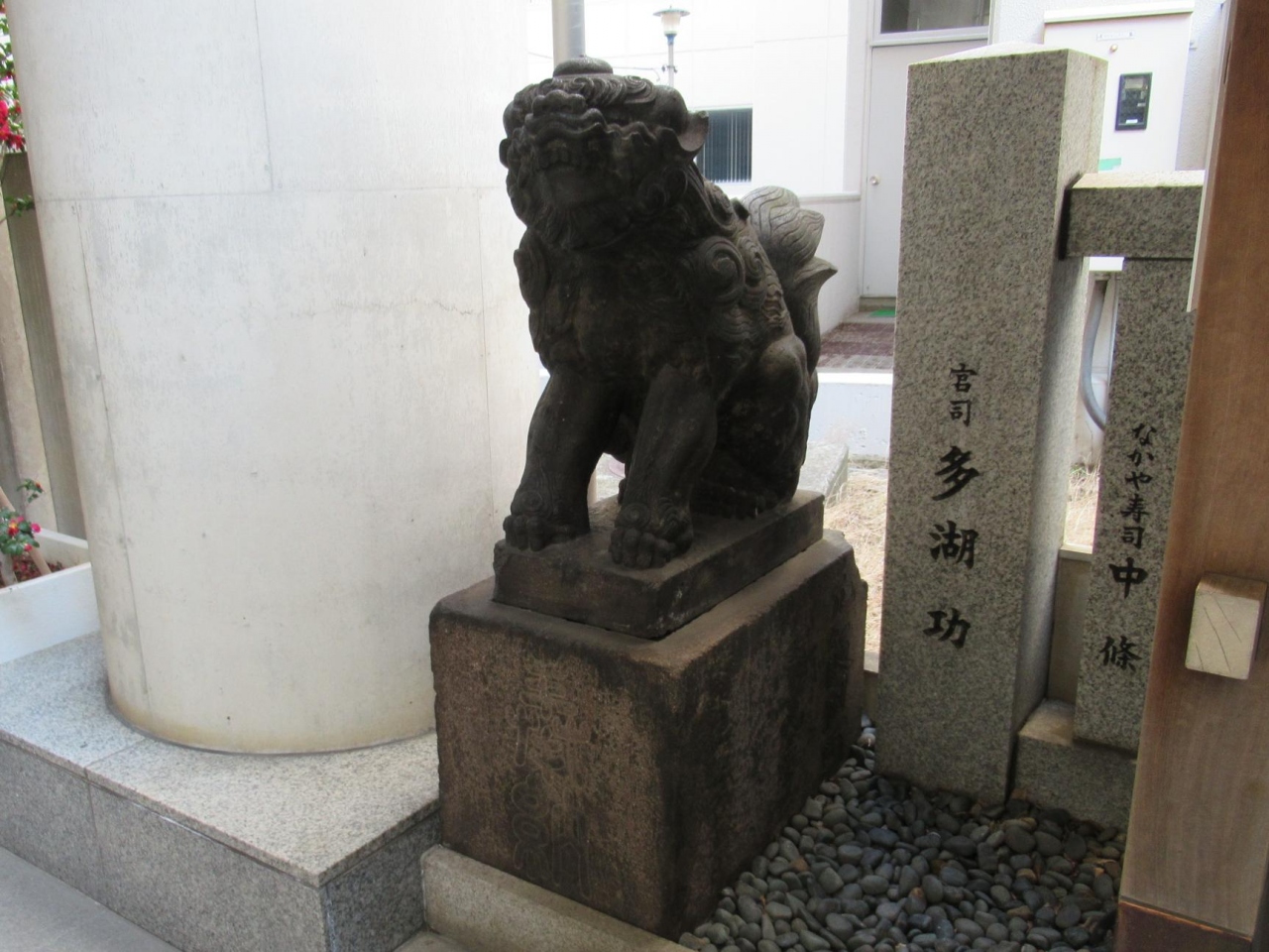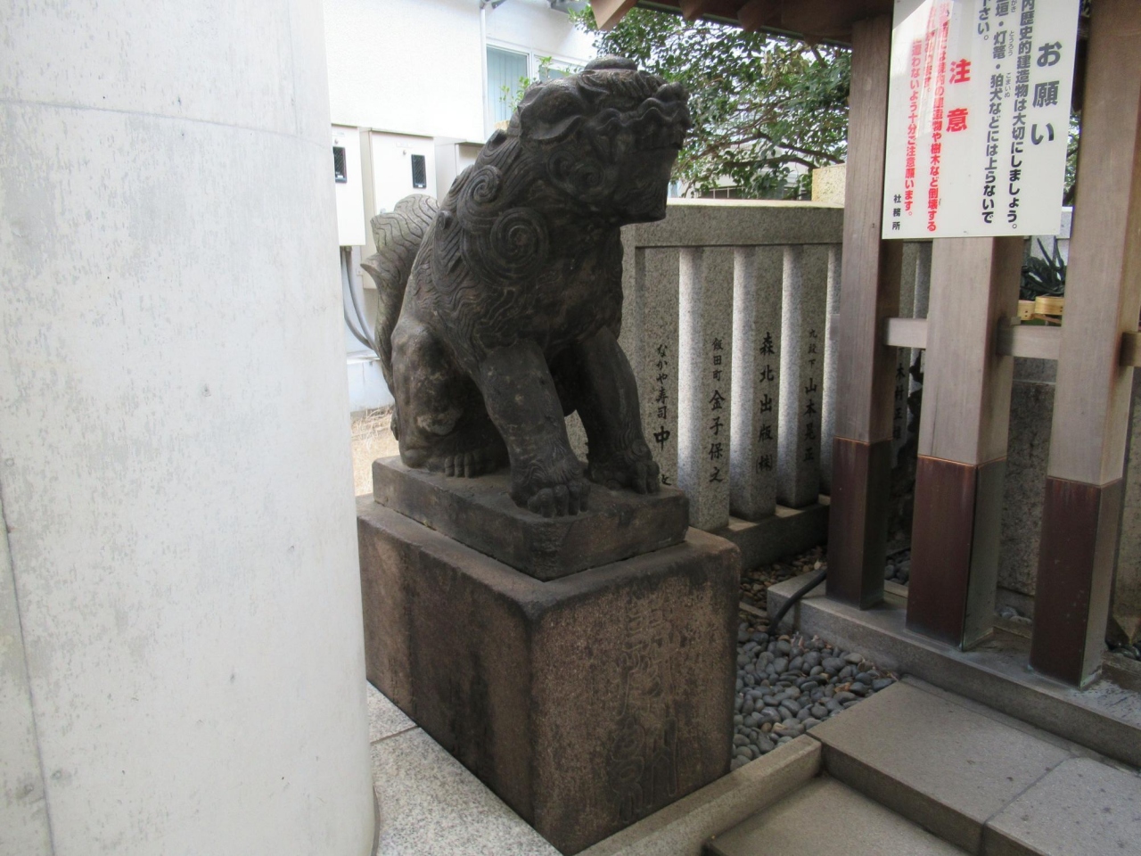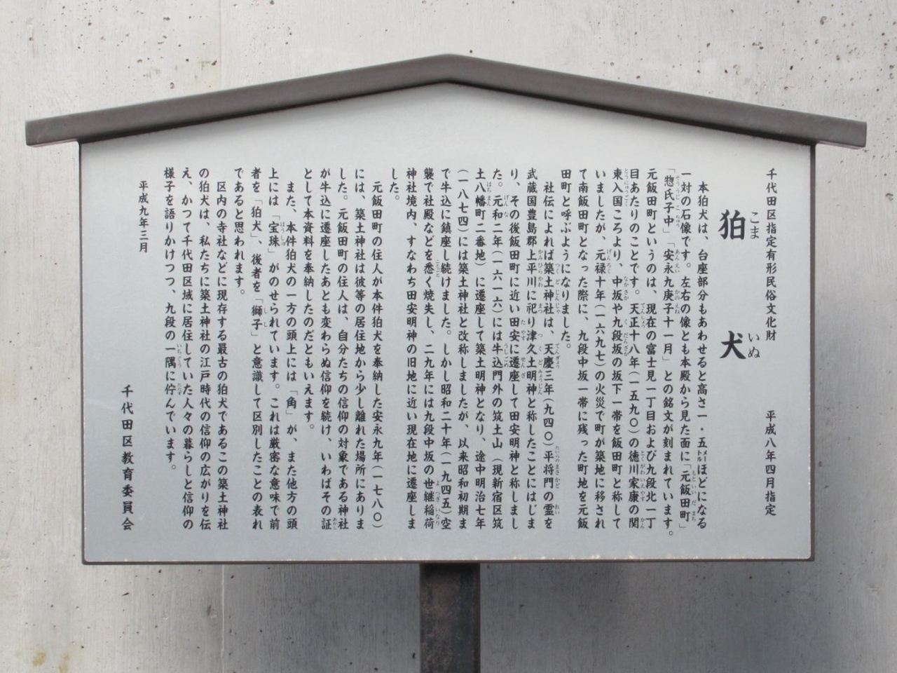 この狛犬は、千代田区指定有形民俗文化財になっていて、台座部分を合わせ高さ1.5m程の石像で、元飯田町の住人が安永9年 (1780) に、築土神社が居住地から遷座し少し離れていたが、変わらぬ信仰を続け奉納した。