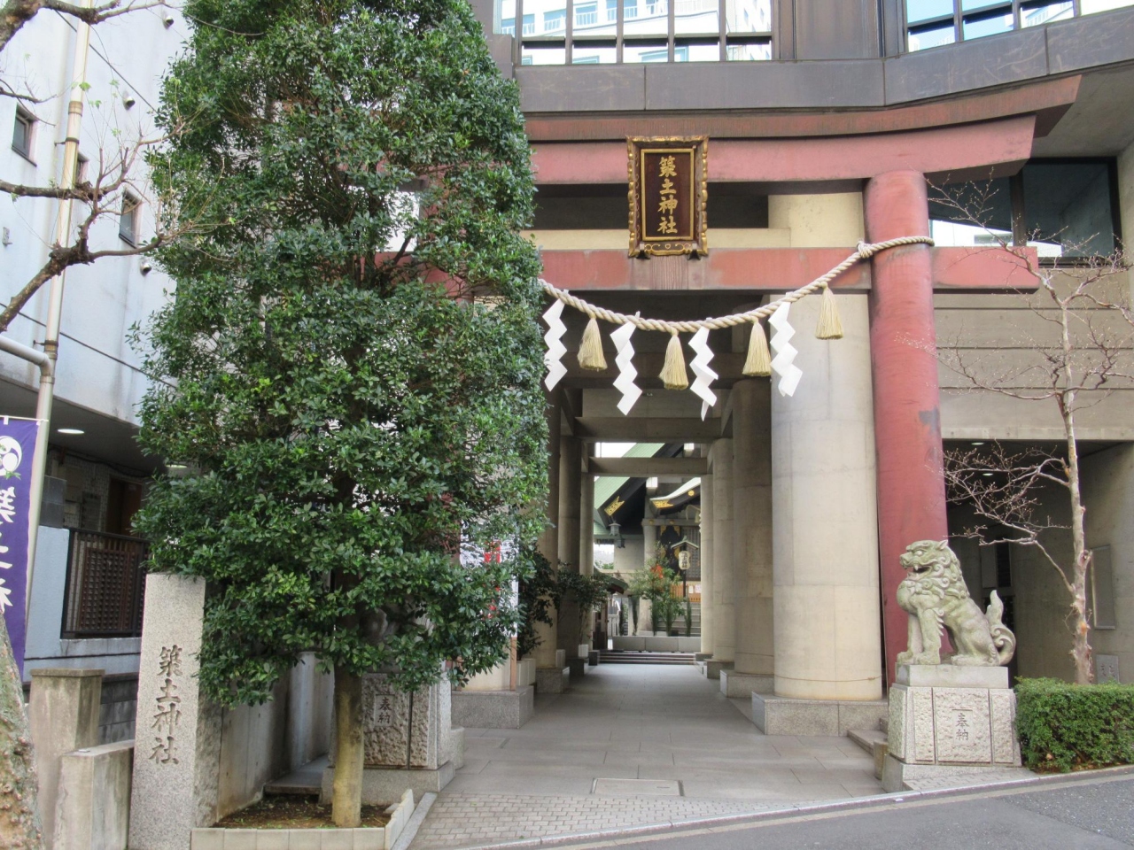 - 地下鉄・九段下駅出入口7を出て直ぐの九段北一丁目交差点を左折し中坂を1分少々上がった左手のビル前に鳥居があるところが築土神社です