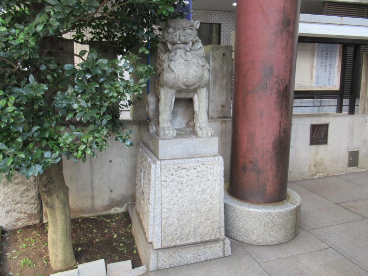 一方、鳥居前の狛犬には、説明書きなど見当たらず良く分からないものの、目を大きく見開き牙を出しきりりとした姿で、ここ築土神社を守護していることが窺えます。