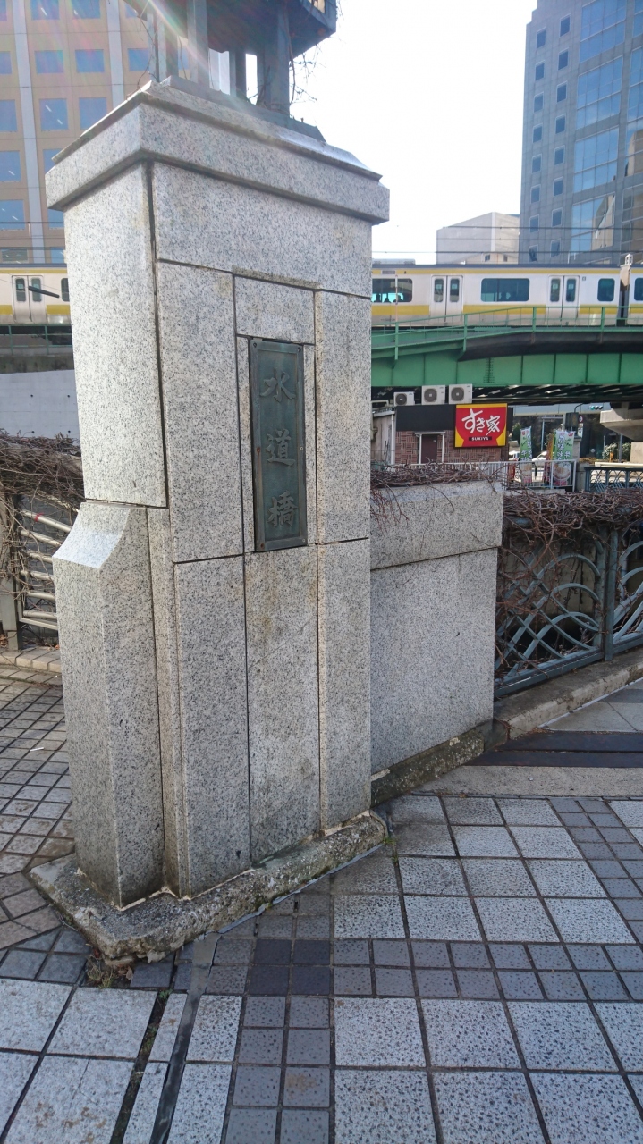 徳川時代の初期、神田川の開削とほぼ同時に架けられた橋で、当時は付近にあった吉祥寺にちなんで、吉祥寺橋と呼ばれていたようです。吉祥寺焼失後に、神田上水の掛樋(水道の通る道)が上流に掛けられた頃から『水道橋』と呼ばれました。今では東京ドーム等に行く人たちが大勢通る橋となっており、とても賑わっていました。