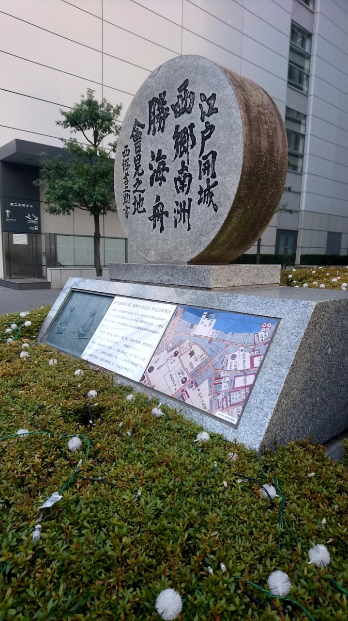 歴史上有名な江戸城無血開城を果たした西郷隆盛と勝海舟の会見の地が三田駅の近くにありました。かつて、ここには薩摩藩の蔵屋敷があったそうです。今は石碑が置かれているだけですが、明治維新の英雄たちの会談シーンが目に浮かびました。