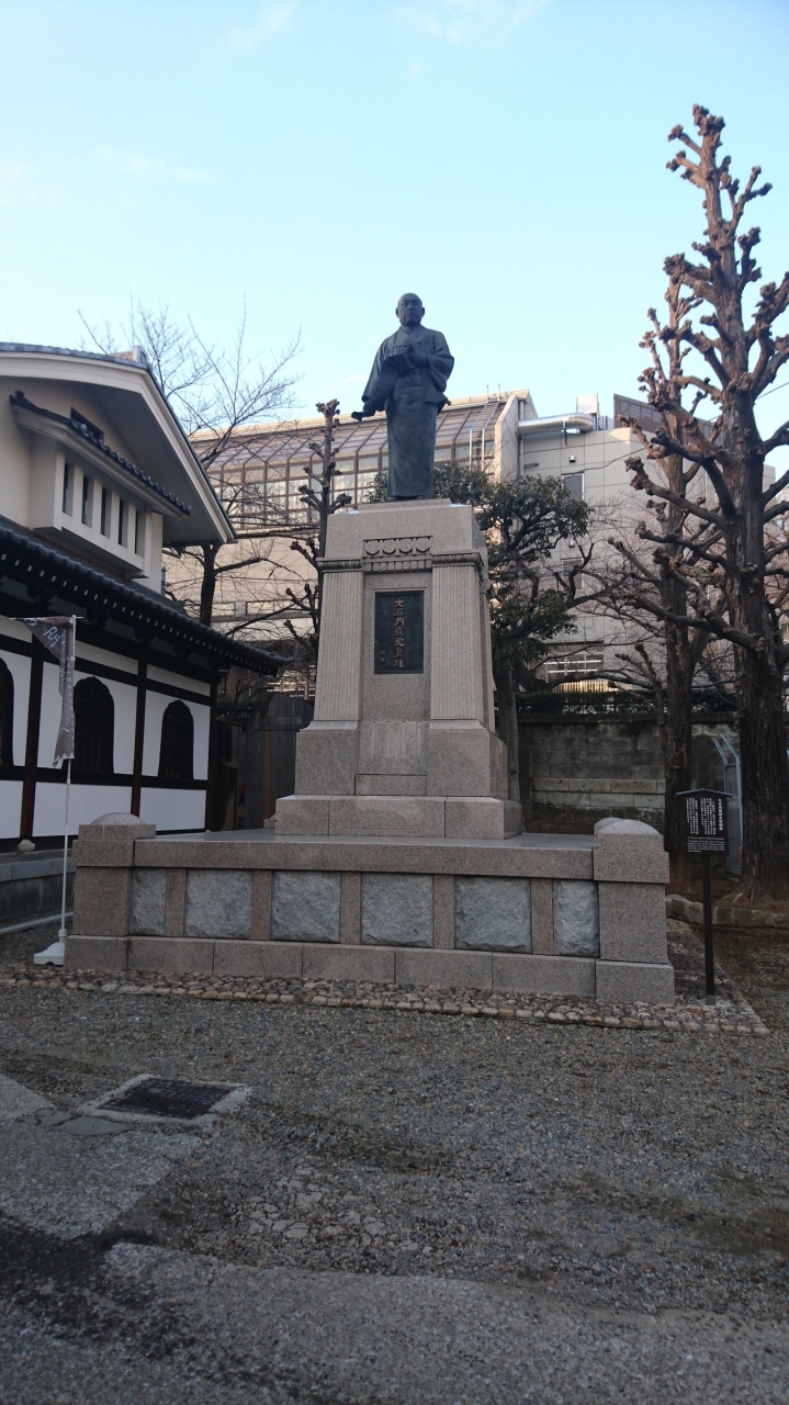 浪曲の宗家・桃中軒雲右衛門の発願により鋳造されたもので、所有者が点々とした後、泉岳寺に寄進されました。元禄羽織を身につけ内蔵助が、連番状を手にして東の空(江戸方向)をじっとにらんでいる姿を表したもので、主君の仇を討とうとする義士たちの心が伝わってきました。