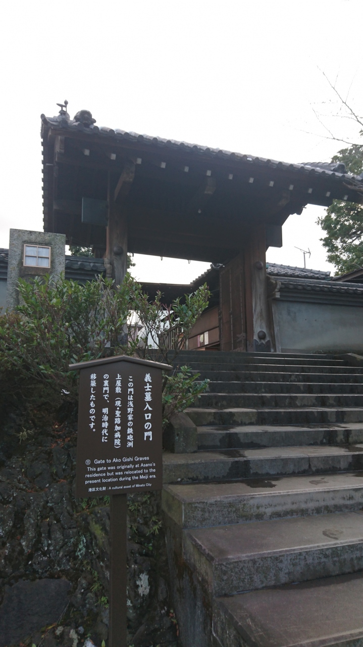 泉岳寺に入ると左手の方に赤穂浪士四十七士の墓所があります。その入口にあるのは浅野家の鉄砲洲上屋敷裏門を明治時代に移築したものだそうです。浅野家と泉岳寺の関係の深さを感じ、忠臣蔵の義士たちの冥福を祈りました。