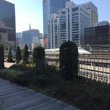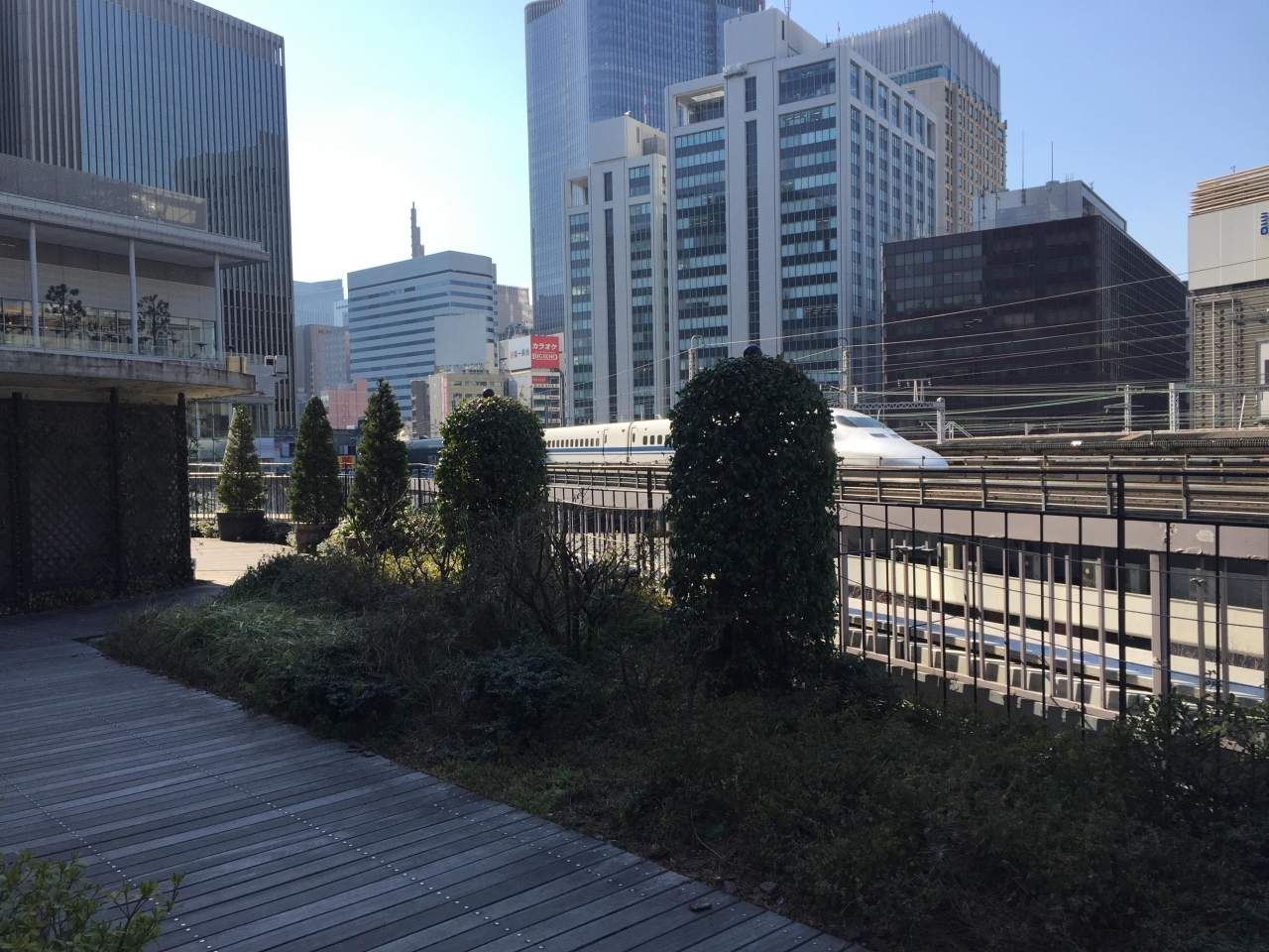 有楽町駅前にある東京交通会館。これまで何度か訪れている施設ですが、ここに屋外広場があるのを初めて知りました。場所は3階。木のテラスと石のテラスがそれぞれ両サイドにあります。木のテラスのほうが広くて、目の前にJR線を眺めることが出来ます。少し待っていれば新幹線を間近にっていうことも。反対側の石のテラスからは首都高が目の前でした。