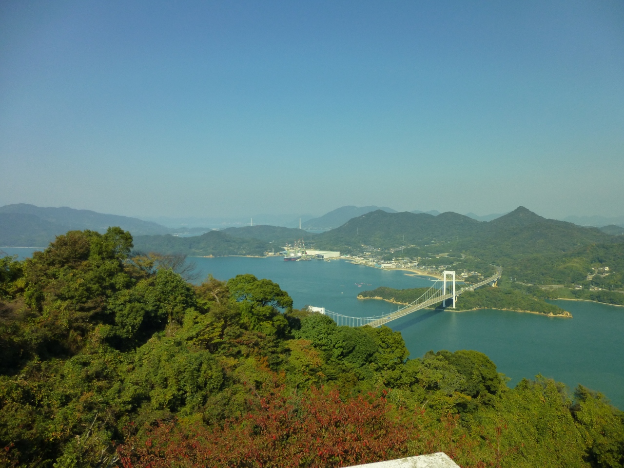 しまなみ街道を尾道から今治までサイクリングで走破しました。当然いくつもの橋を通るのですが、この橋は多々羅大橋や来島海峡大橋に比べると短く、ちょっと地味です。ただ島のカレイ山展望台から眺めた橋は橋は綺麗でした。