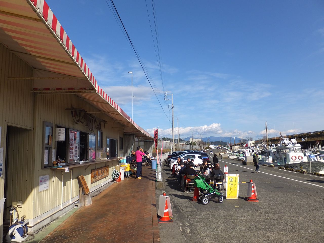 曲がり角の看板を見落とさぬように海の方へ。国道をくぐった先に左におれた先、漁港のど真ん前です。まさに港の中の食堂。プレハブの細長い建物です。人でいっぱいですからすぐわかります。