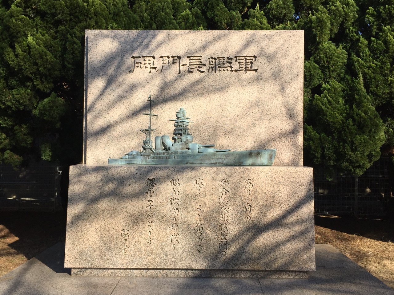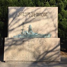 公園内の奥のほう、ポンプ場の建物の横に記念碑がたくさん並んでいる一角にあります。軍艦のブロンズ像がのっており、見ごたえある石碑です。
