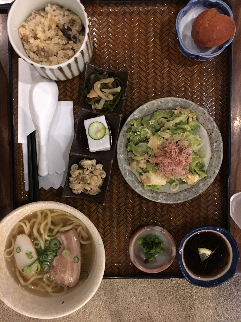 国際通り沿いに立派な店構えのお店があったのでランチで入ってみました。沖縄そばとゴーヤチャンプルとジーマミー豆腐があるちゅらさん御膳1100円食べました。店内はテーブル席と座敷両方あって過ごしやすかったです。