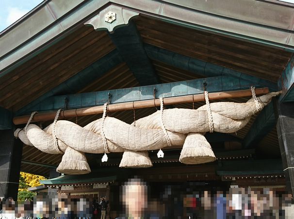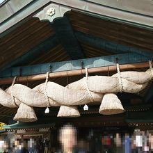 出雲大社本殿の西側に神楽殿はありました。大きなしめ縄が有名でよくテレビなどでも紹介されています。この日も多くの参拝者で賑わっていました。太さ約9m、重さ約5tの大しめ縄は間近で見るとあまりの巨大さに圧倒されました。