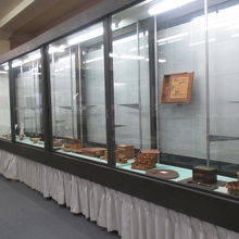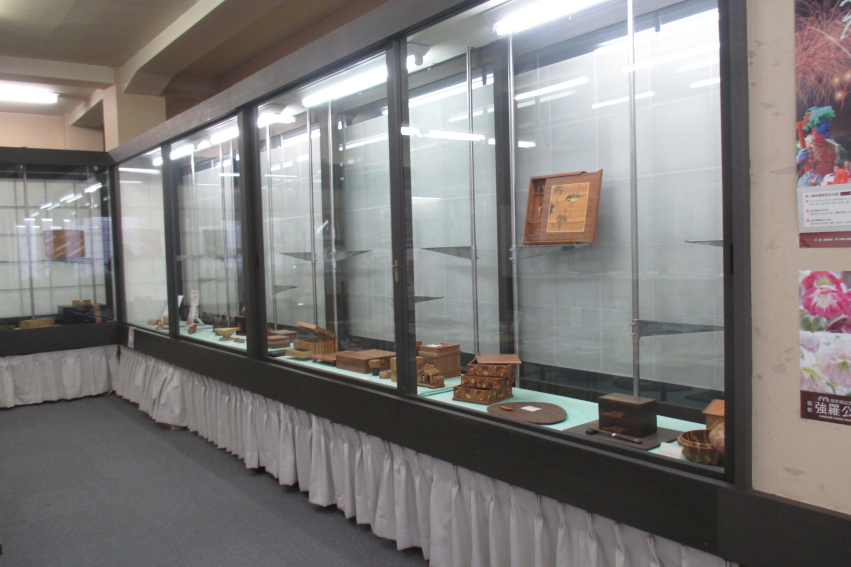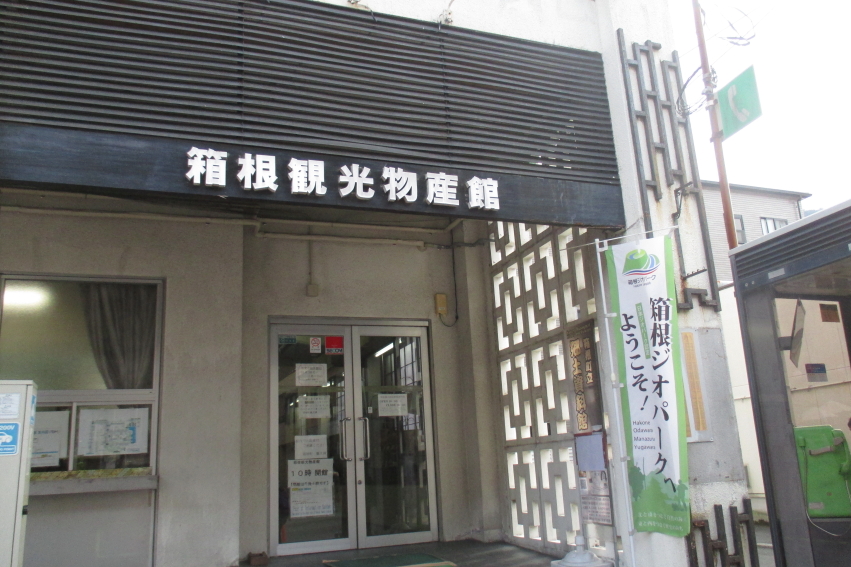 古めかしい建物に入ると、スタッフの人が1人だけ座っていました。お客さんはゼロです。観光施設のパンフレットなどが平置きされ、その奥のガラス張りケースには箱根寄木細工などの箱根の名産品が展示されています。表に観光物産館と看板は出ていますから、何人かはお客さんが居ても良さそうですが、場所が悪いのですかね。もったいない施設だなぁと思いました。