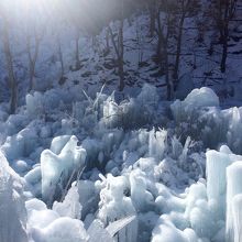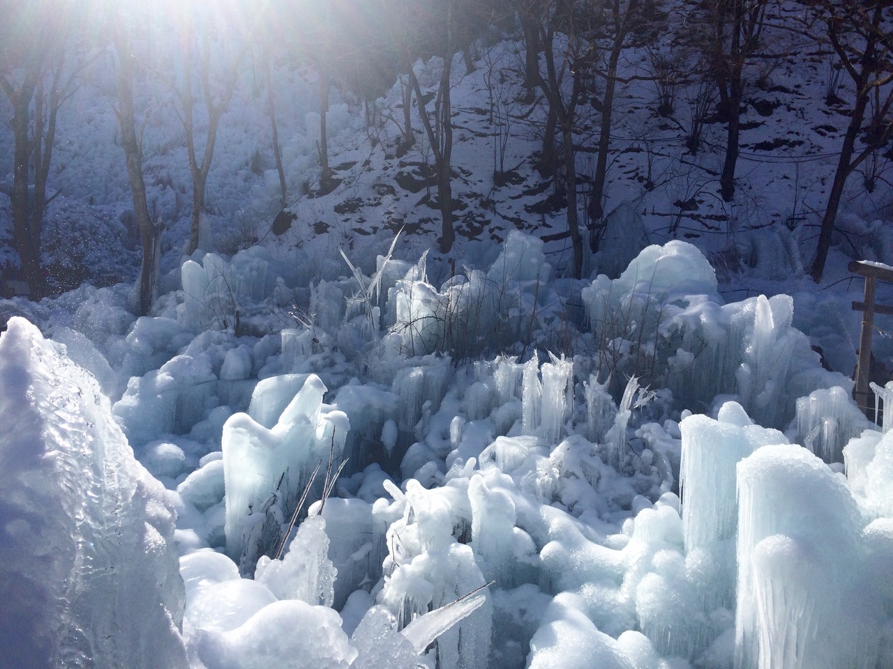 1500平方メートルある敷地内を、氷柱を見ながら散策できます。歩きやすいよう歩道には木のチップが敷き詰められていました。人工の氷柱ですが氷の世界は幻想的で綺麗でした。環境整備協力金300円かかりますが、甘酒か紅茶を無料でいただけます。