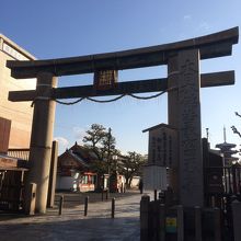 大きな鳥居で境内に入るいくつかの出入口でしめ縄が掛かっていましたが鳥居が大きいため、しめ縄は細く見えました。鳥居から境内の大きな建物が見えます。鳥居の下には杭のようなものが建っていて車等、通行出来ないようにしてありました。