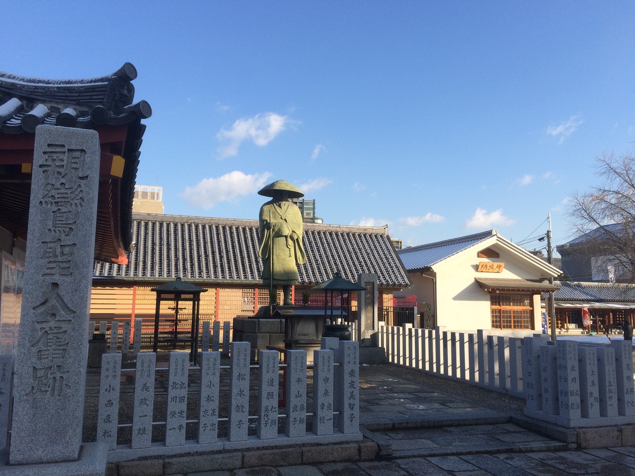 石鳥居を潜ると真っ直ぐに直線が伸びていて正面に大きな極楽門があり、その手前の左側にある目立つ像で菅笠を被り修行僧ので格好をしております。菅笠を深めに被っているので顔の表情は分かりませんでした。周りを立て石で囲まれた場所にあります。