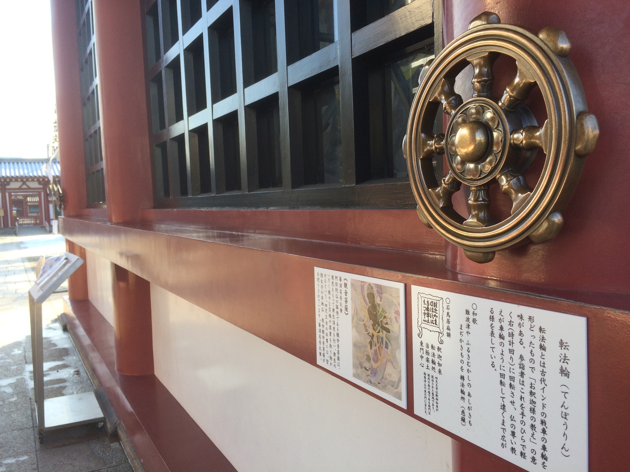 極楽門をくぐったら、あまり見かけない船の舵をとる丸いものが目につきました。中心部の丸から8つの棒が伸びている円形のものでした。古代インドの戦車を形だったもので、手のひらで軽く右側に回してみると良いようです。