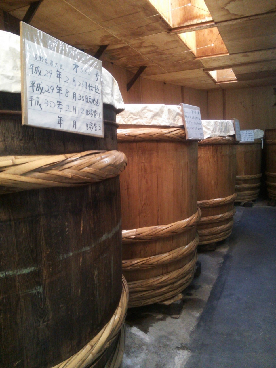 工場は無料で見学が出来ます。巨大な杉の桶が並んでいて、国産の大豆で発酵醸造の味噌が熟成されています。