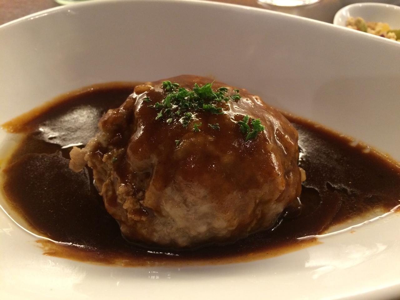 早い時間と遅い時間のみ頼める2500円コース。名物の飲めるハンバーグは二人で1個ですが、お得感あります。ユッケ、アヒージョ、ステーキ、肉寿司など。サラダもオシャレです。女性ならこのコースだけでも満足かも。男性は何品か追加が必要。500円のお通しのドライフルーツとナッツは、イマイチでした。