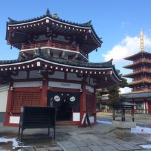 6角形の建物で、赤い色が見事でした。屋根が二層になっていて五重の塔と合わせて見るとより良い景観でした。中に入ることも出来、ロウソクがいつくか点いていました。外側は小さな四角が連なっていて、障子のように見えました。