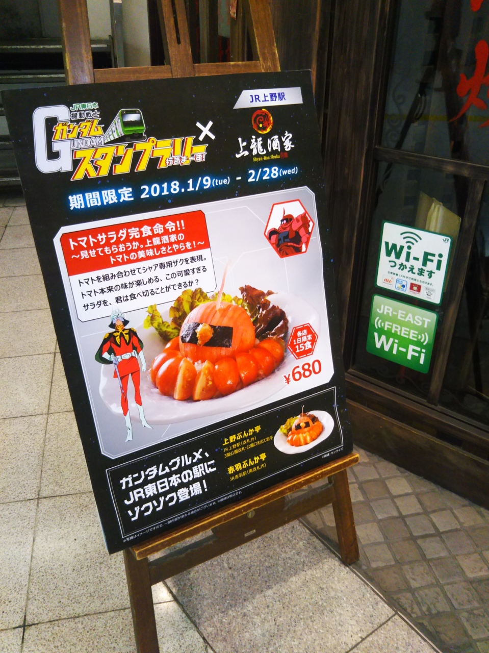 JR上野駅の入谷口改札をでた目の前にある中華料理店です。JR東日本とガンダムのスタンプラリーで限定メニューがありました。シャア専用のザクを模したトマトサラダです。数量限定です。そのほかマーボー豆腐はかなり辛くておいしかったです。