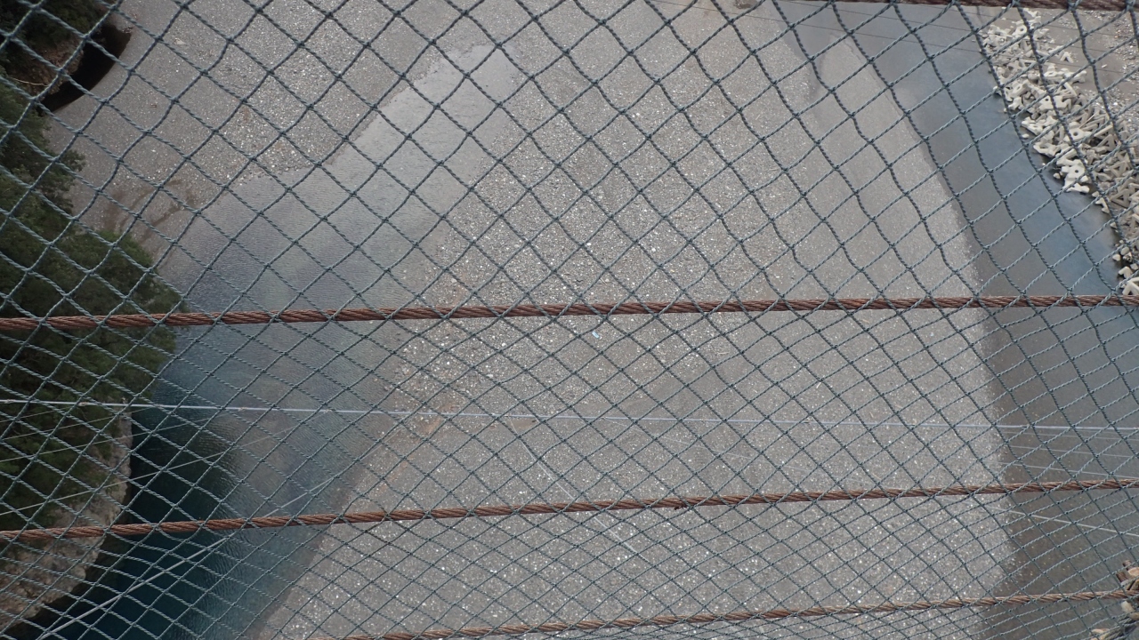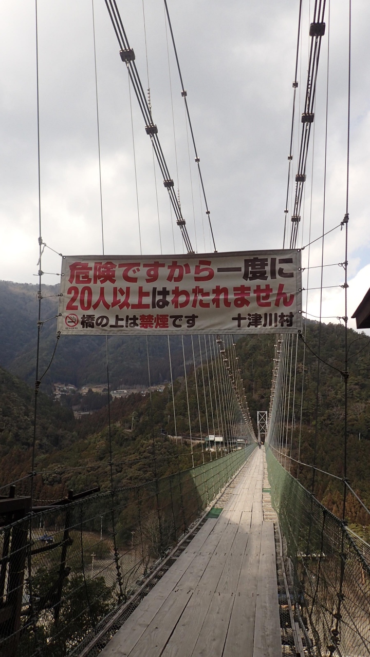 生活道としては日本一長い吊り橋で、20人以上は同時に渡らないようにと書かれており、1度目は渡りすぎないよう人員整理をする方がいらしたが、今回は冬期だったためか、どなたもいらっしゃらなかった。