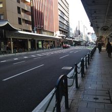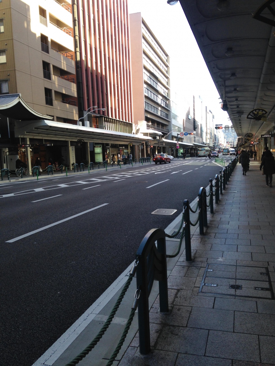 四条烏丸から祇園まで歩きましたが、この通りは大丸やタカシマヤなど百貨店が並ぶ京都のメインストリートです。四条通を南北に走る細い通りも多く、歩道を歩いていても信号待ちでよく立ち止まります。したがって、四条通りを通るバスもよくとまります。