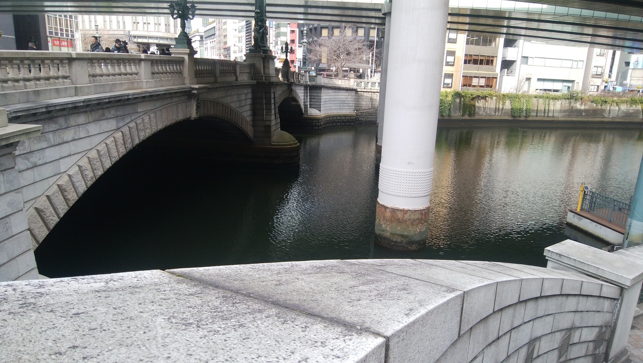 対して橋の上は日本の中枢のオフィス街に有るのでランチに向かうサラリーマンで一杯