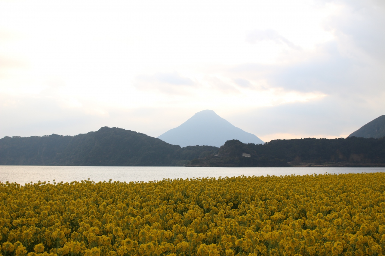 池田湖の湖畔に菜の花畑が広がっており、池田湖越しに開聞岳が見えて指宿を代表する景観です。近くにドライブインのような場所があり車を止めて散策することができます。