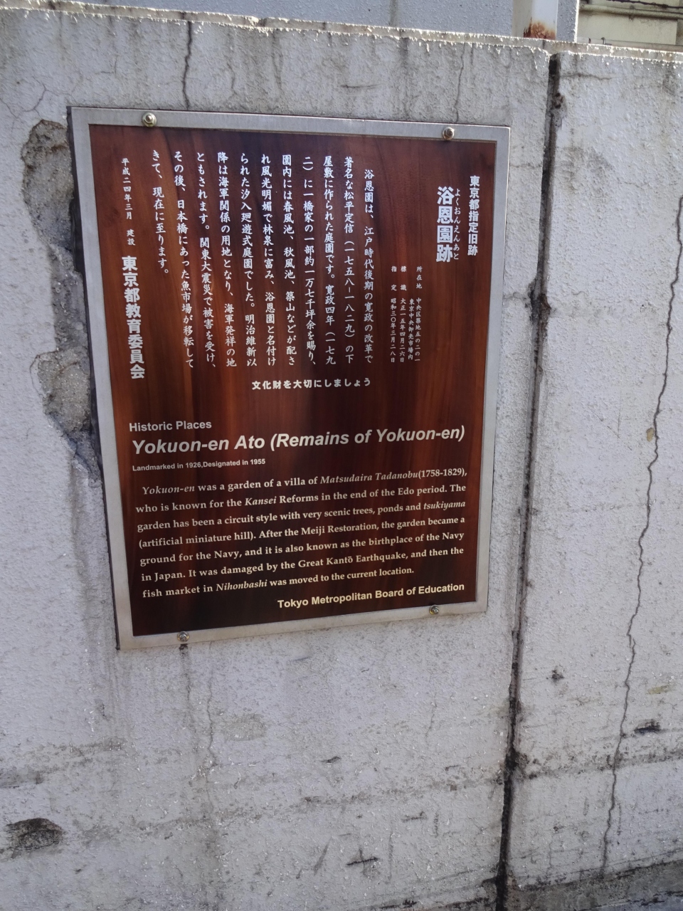 浴恩園の跡地を示すプレートが築地の魚市場の外壁に設置されていました。