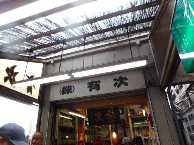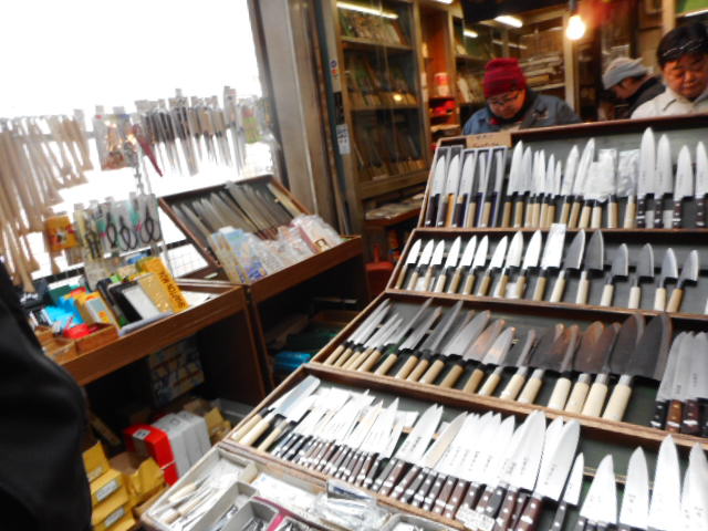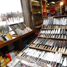 築地市場の一角にある老舗刃物専門店で、京都、錦市場にもありますが、こちらは独立した本店だそうで、店内には、数々の刃物類が並んでいます。職人さんが使う専門の刃物を研いでいる店員さんも、又、職人さんです。外国人観光客が興味深そうに見ていました。