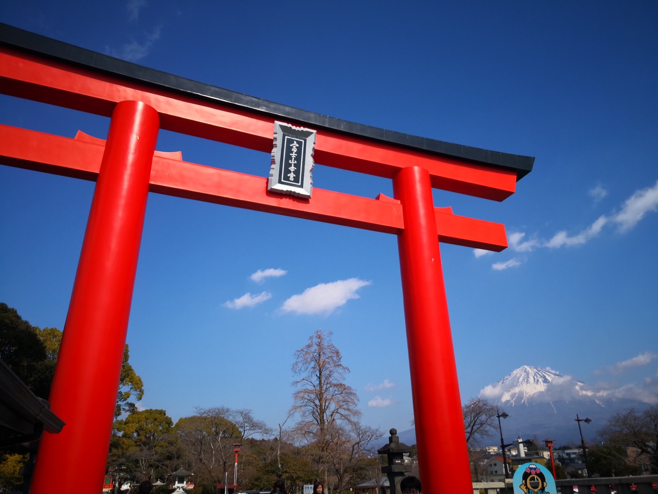 入り口の鳥居からは富士山が綺麗に望めます。桜が咲いたらとても綺麗な雰囲気になりそうな参道を通ってお参りしてきました。