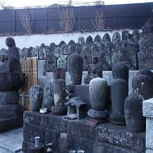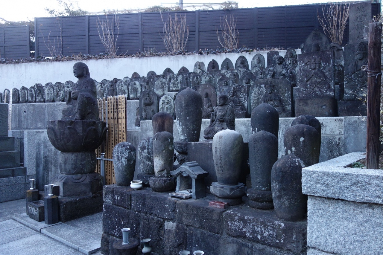 明治通り沿いにある長泉寺へうかがった時にこちらの石仏群を見る事が出来ました。山門を入り本堂に向かって左側に墓地への入り口が有るのですが、その墓地の一番奥側、線路に沿った場所に古い石仏がたくさん安置されている場所が有ります。独特の雰囲気が有りました。