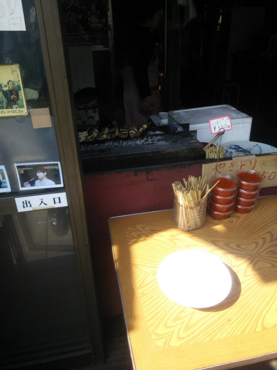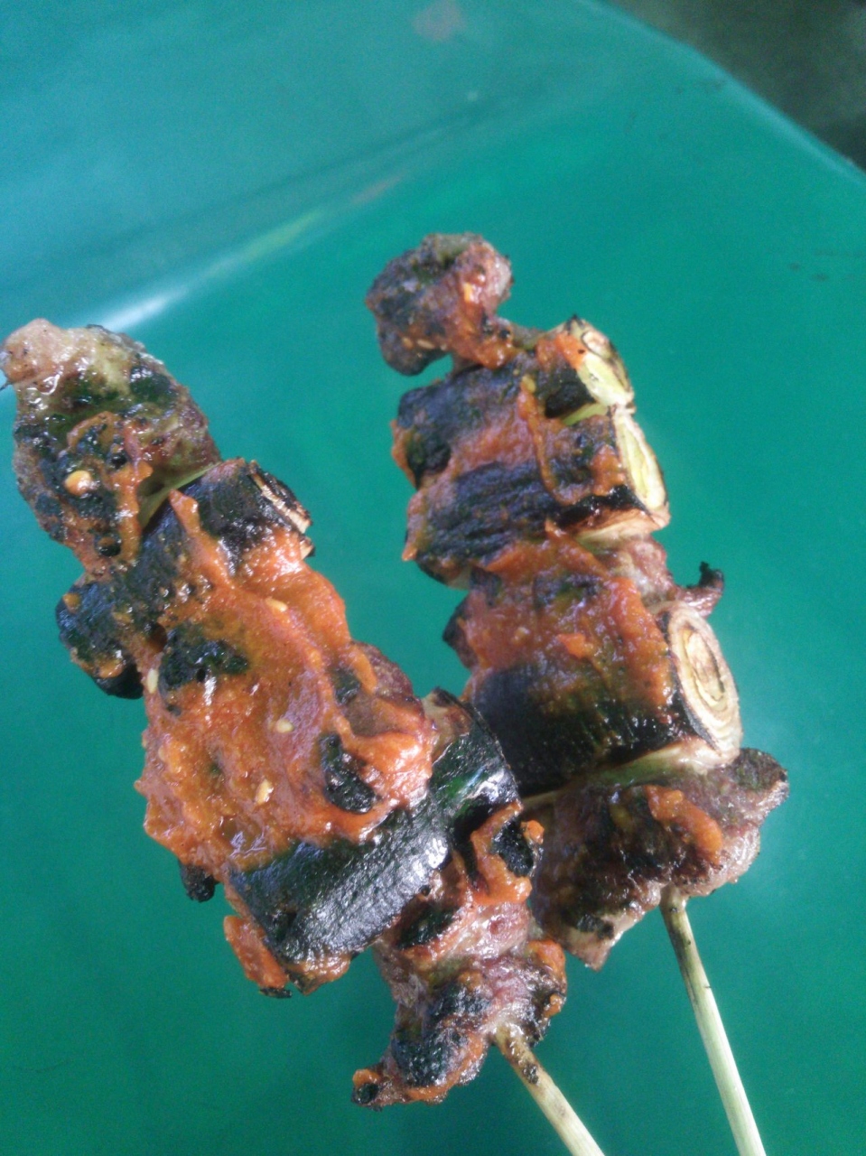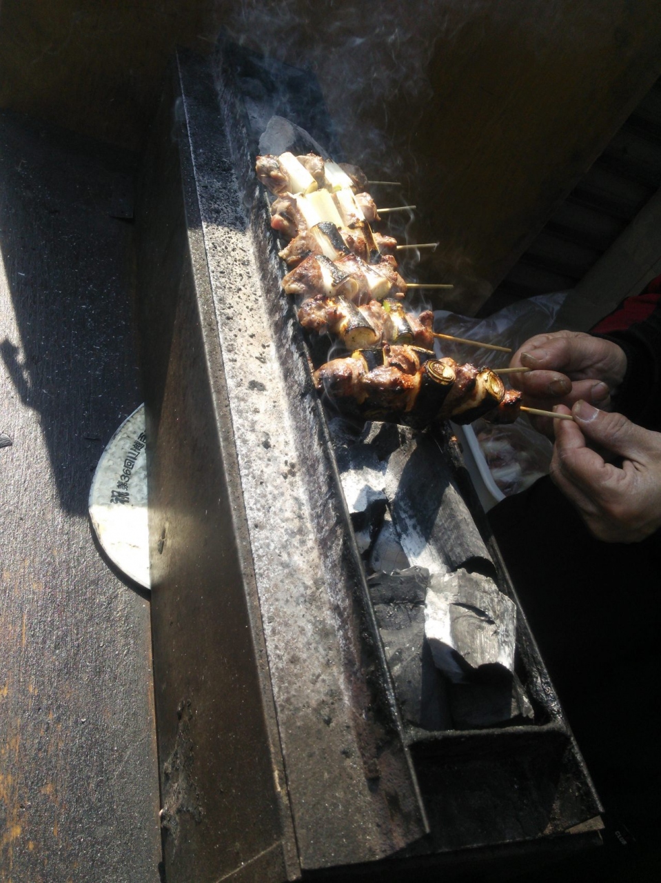 店先で焼いていて、焼き上がるとオレンジ色のピリ辛味噌を塗って完成です。お酒のツマミに最高です。