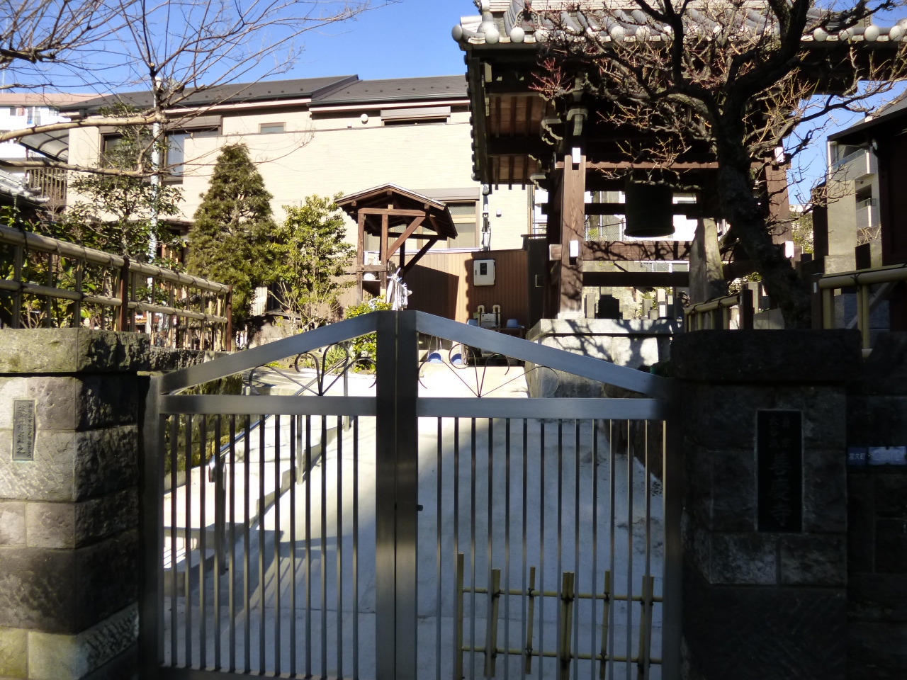 靖国通り沿いに「善慶寺」と記された石柱があり、スロープを登っていくと山門につながります。平日の午前中に訪れたところ、残念ながら山門が閉じられていました。