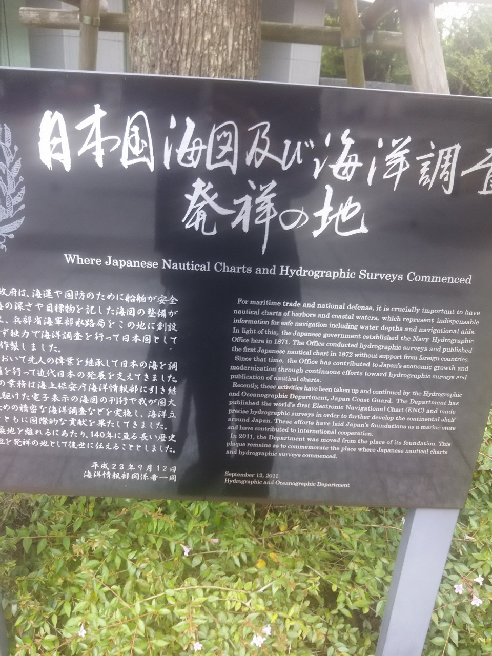 築地の朝日新聞のそばにあります。最寄りの駅としては都営線の大江戸線の築地市場前になります。場所としては朝日新聞社側の橋のたもとにこちらの記念碑があり、海図の発祥がこちらの場所になるそうです。このエリアは江戸の名残があり海軍兵学寮などがあったエリアになります
