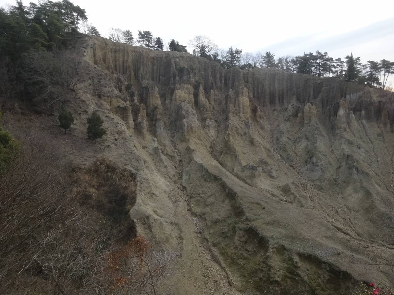 徳島自動車道の阿波PAにレンタカーを駐車して、土柱まで歩いて行きました。土柱観光客のために、PAから外に出られるようになっています。初めて見る地形で、独特の柱状の岩がにょきにょき生えており、興味深かったです。