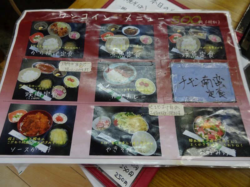 浅間神社からほど近い鉄板焼きの店です。店外には、「明日香 神田店」「ワンコイン亭」という看板がありました。「ワンコイン」に釣られて入店。