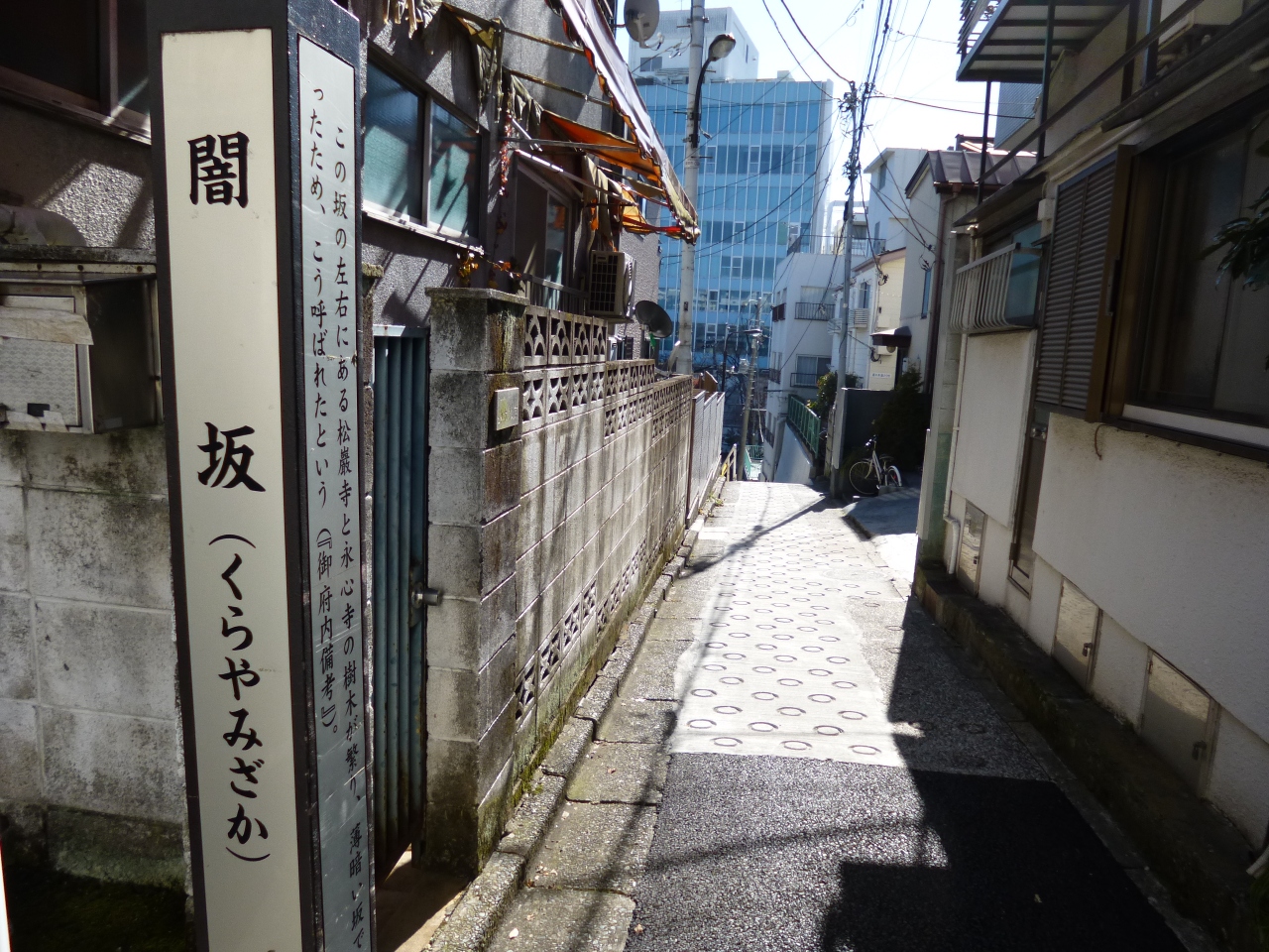 四谷界隈の裏手には数多くの坂がありますが、その中でも細くて狭い坂が「闇坂」です。都内には同じ名前の坂が多いですが、こちらの「闇坂」が最もその名前が当てはまっていると感じました。夜には通りたくない、そんな暗闇が頭に浮かびそうな坂でした。