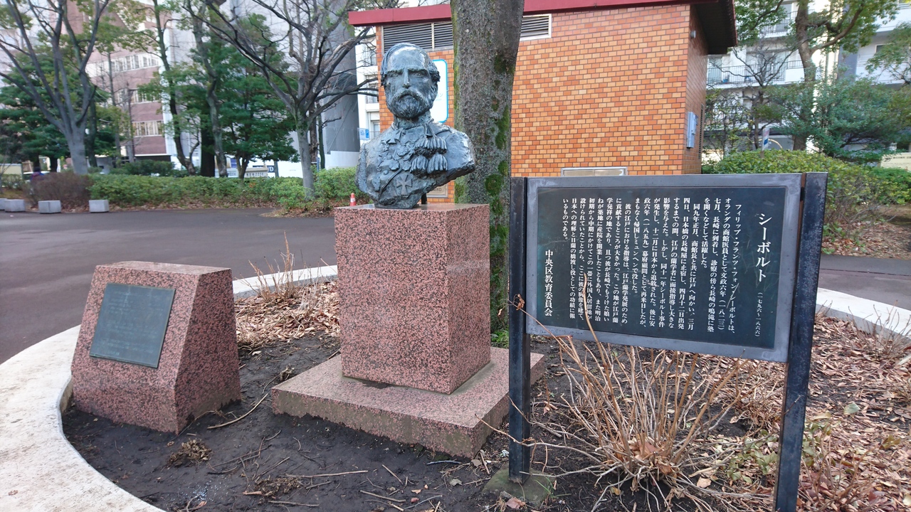 築地のあかつき公園内にシーボルトの胸像がありました。シーボルトと築地の関係は深く、この地で江戸の蘭学者に直接指導していたそうです。また、この地には彼の娘であるいねが産院を開業したそうです。日本に蘭学を広めたシーボルトの功績を知ることができました。