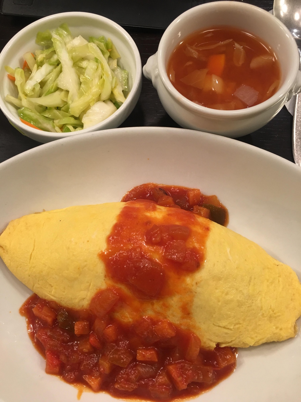 オムライス(ピリ辛ソース)のセットをいただきました。セットにはコールスローとスープがついてきます。