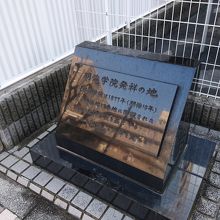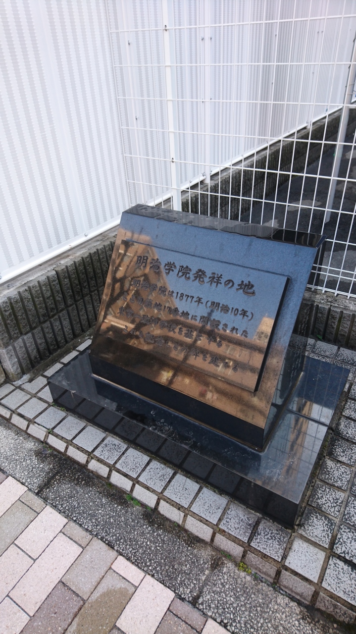 築地にある聖路加ガーデン前の歩道を北に進んでいくと、菓子の塩瀬総本家の前に黒い石碑が建っていました。横浜居留地に開設されたヘボン塾が、この場所に移転してきたのが明治学院の始まりです。築地には明治学院のほか数多くの私塾が開設されていることに驚きました。
