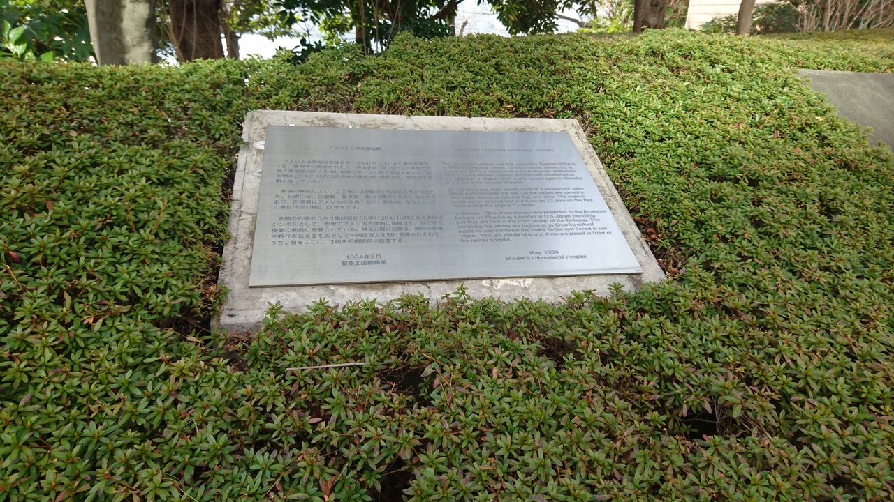 初代アメリカ公使であるハリスが明治8年に築地居留地内に公館を新築しました。そのため、聖路加ガーデンの裏側や聖路加国際大学内などあちこちに公使館跡の碑があります。明治初期の江戸の雰囲気が目に浮かぶようでした。