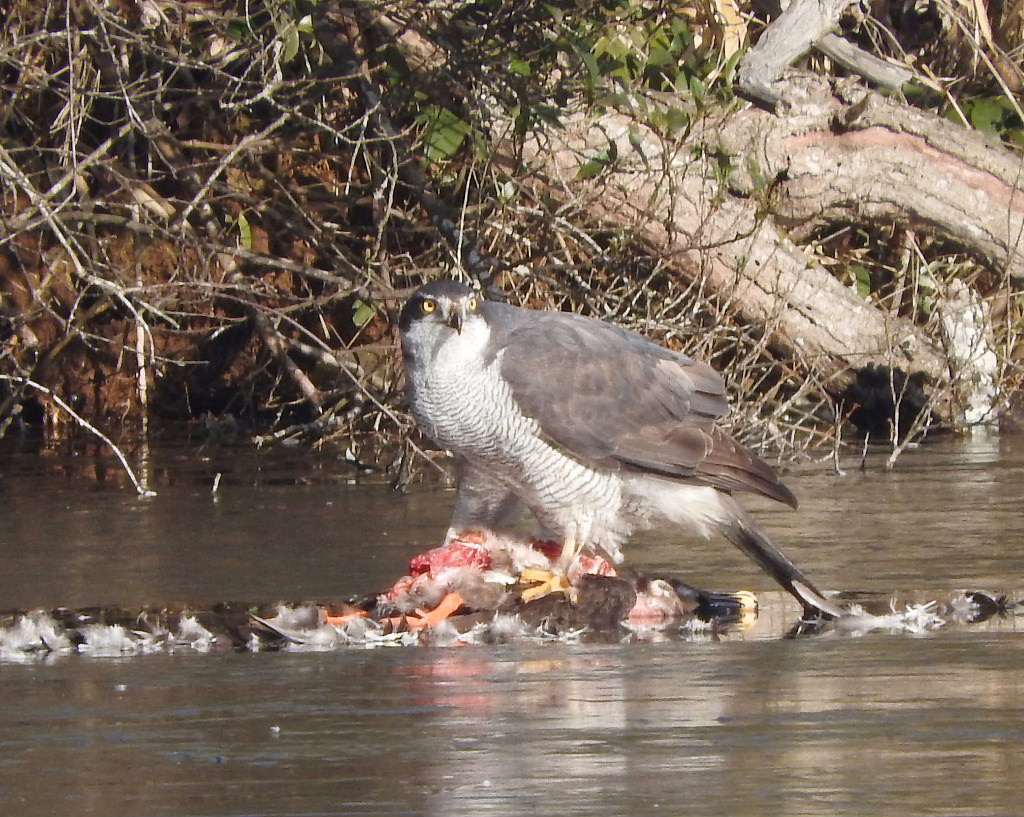 その氷の上で、オオタカが鴨を捕まえて食べていました。