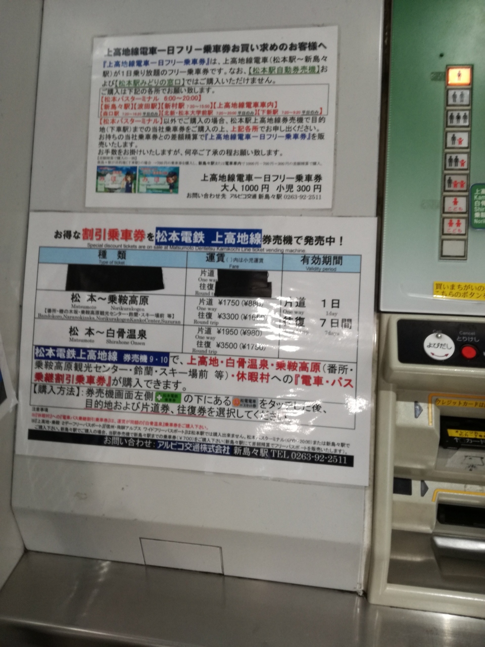 乗鞍方面へ向かう際の割引乗車券について(「観光案内電車」についての情報ではありません)。乗鞍方面へ行く場合は、新島々までこの松本電鉄に乗ってバスに乗り換えることになりますがその場合、松本駅のJRの自動券売機で、乗鞍までのバスとのセットの往復割引乗車券が購入できます。乗鞍まで往復3,300円とお買い得となります。また、松本電鉄の1日乗車券を利用する場合は松本駅では発売しておらず松本バスターミナルで購入するか、最も近くの有人駅まで松本駅の券売機で松本電鉄の切符を購入し、松本電鉄の有人駅で差額支払いで1日乗車券を購入できます