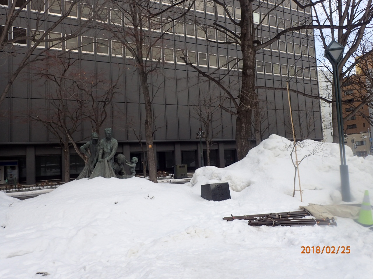 子どもを連れて大通公園のイベントに参加してきました。雪まつり期間には、他の銅像などの周りを雪でかいて見やすくしてあったり、説明書きが見えるようにしてあったのですが、漁民の像は雪で埋もれたままでした。