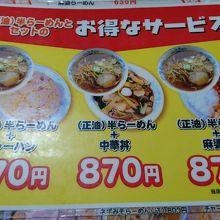 運悪く、前日に餃子の王将に行っていたため、チャーハンと半ラーメンのセットを注文。座席が狭くて、直角の背もたれが座りにくかったですが、料理は美味しかったです!