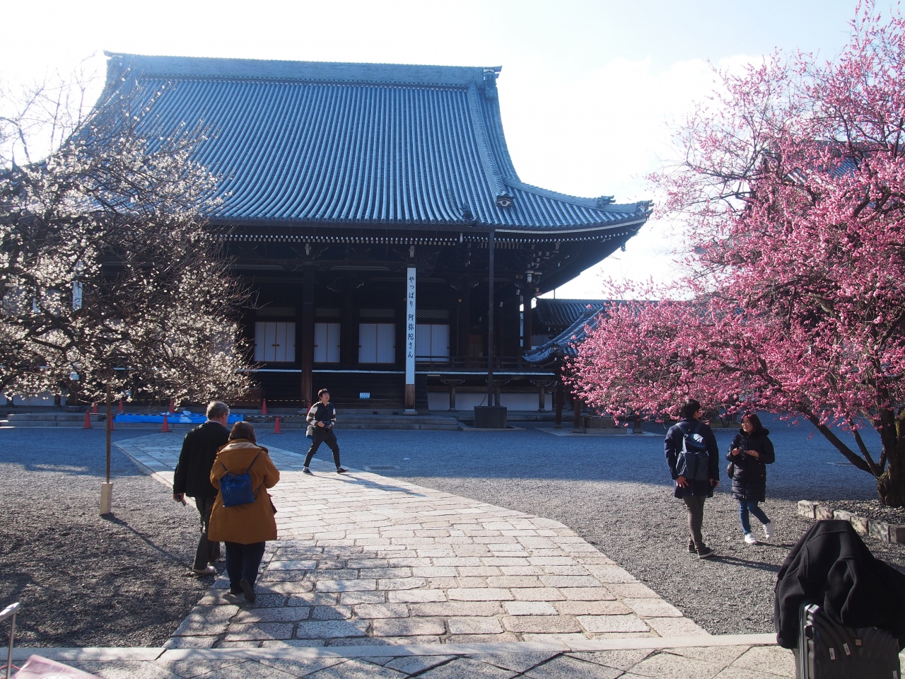 西本願寺のすぐ南側にあるお寺で、大きな本堂があり、広い境内のあるお寺です。表門から入ると境内にはすぐ両側に木があり、片方は白い花、片方は赤い花が咲き誇り、とてもきれいでした。訪れた観光客もそれぞれの木の花の写真を撮っていました。